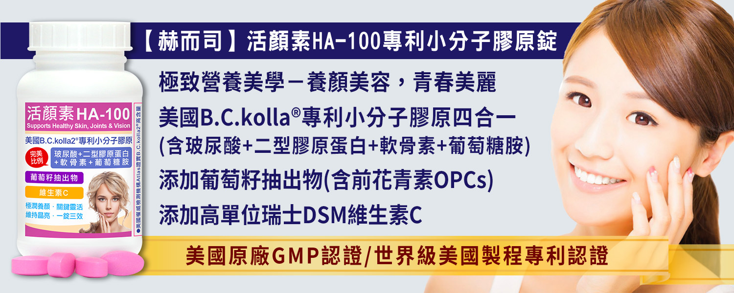 赫而司活顏素HA-100是經過特殊專利製程的B.C.kolla2®複合式小分子膠原,含有珍貴玻尿酸/二型膠原蛋白/軟骨素/葡萄糖胺,可以達到更佳的養顏美容效果,同時還能兼顧維護靈活行動力。