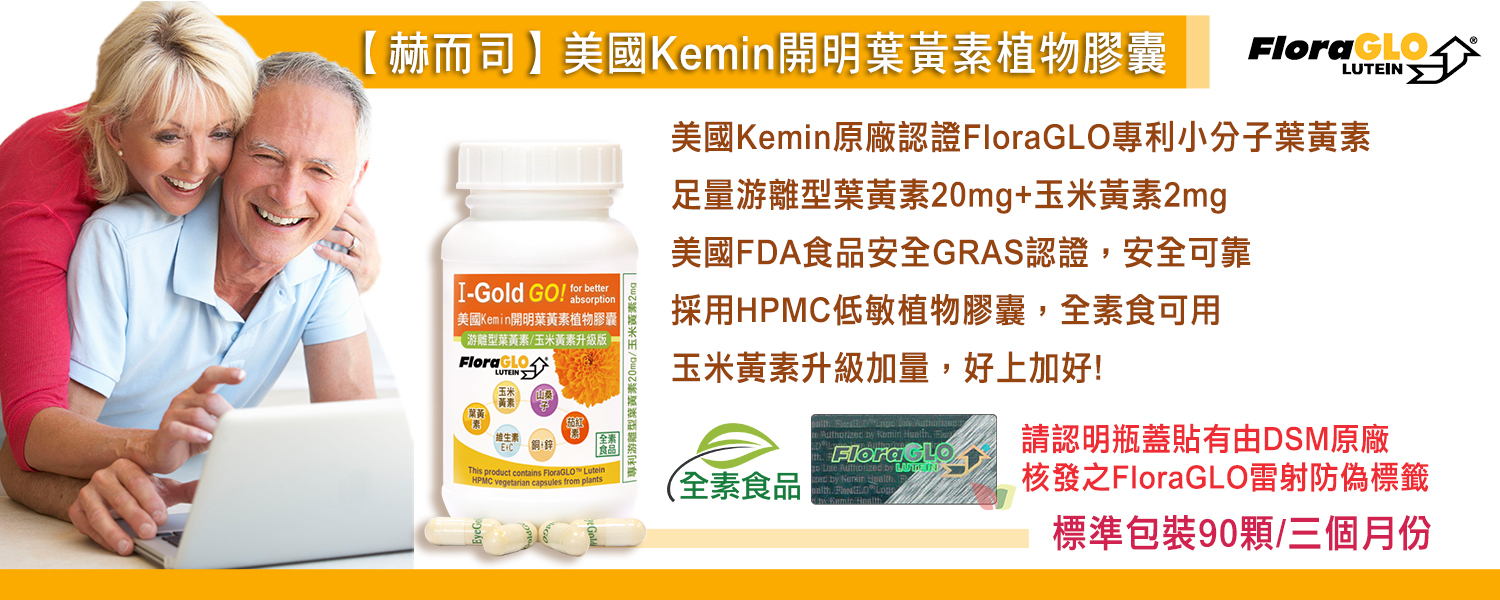 每顆膠囊含有主要成份-美國Kemin超微粒FloraGLO®專利游離型葉黃素20mg。