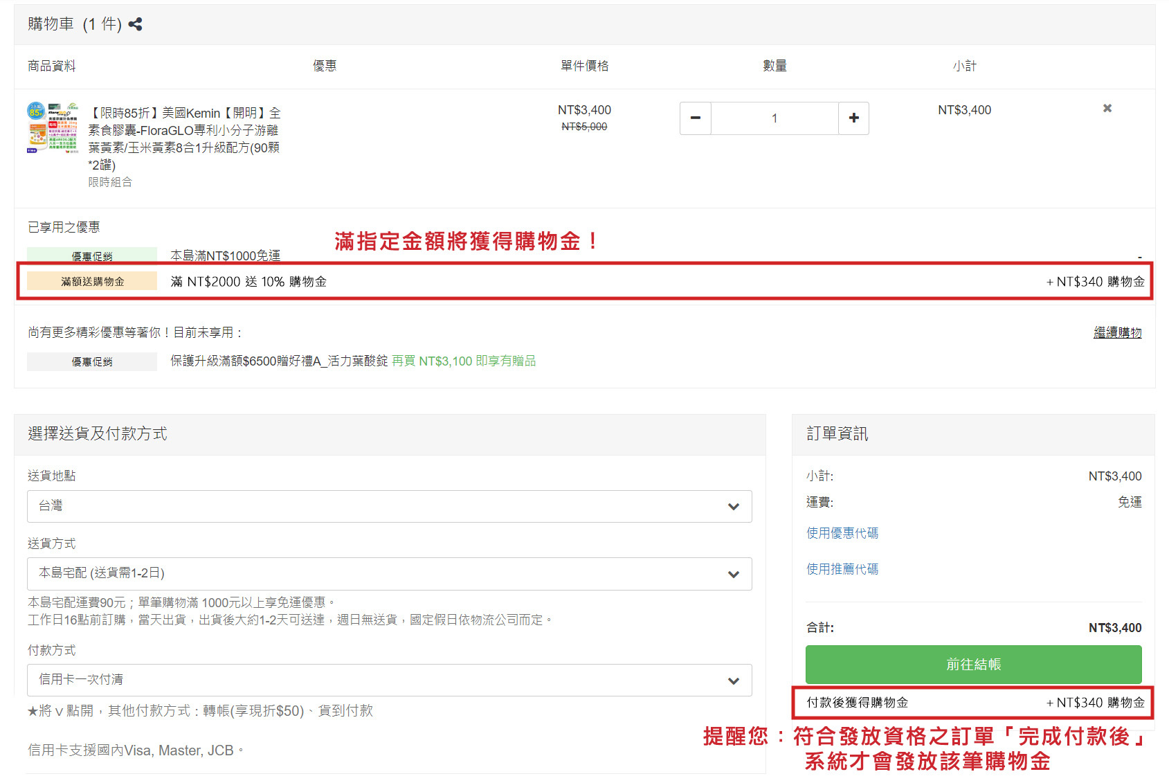 ❣結帳時,結帳頁面將提醒您「付款後獲得購物金」。