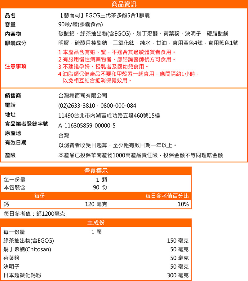 ●綠茶抽出物 (含茶多酚 EGCG) + 甲殼素 + 決明子 + 荷葉粉 + 超微鈣