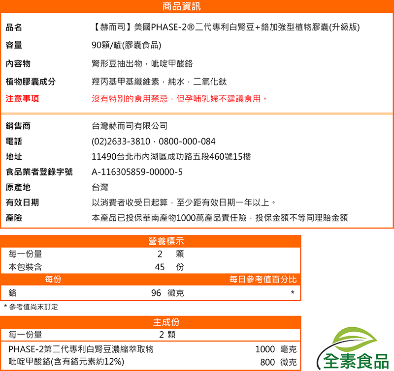 ●加強型:每份含足量1000mg之原廠專利PHASE-2®白腎豆+吡啶甲酸鉻800mcg