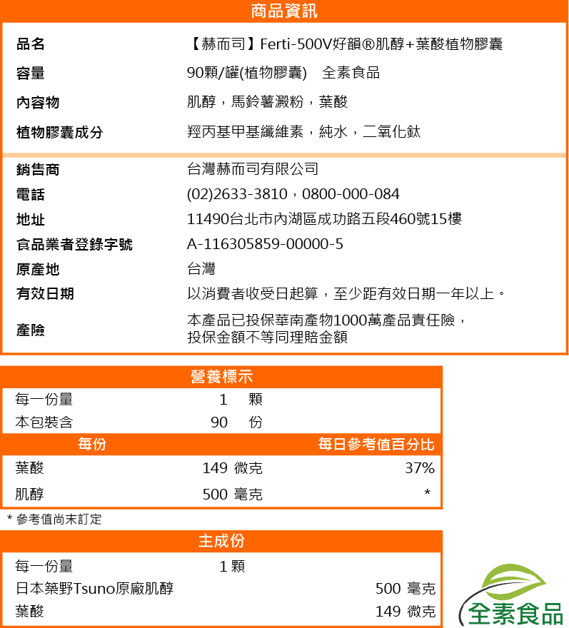 【好韻®】日本築野肌醇+葉酸全素膠囊(90顆*1罐)