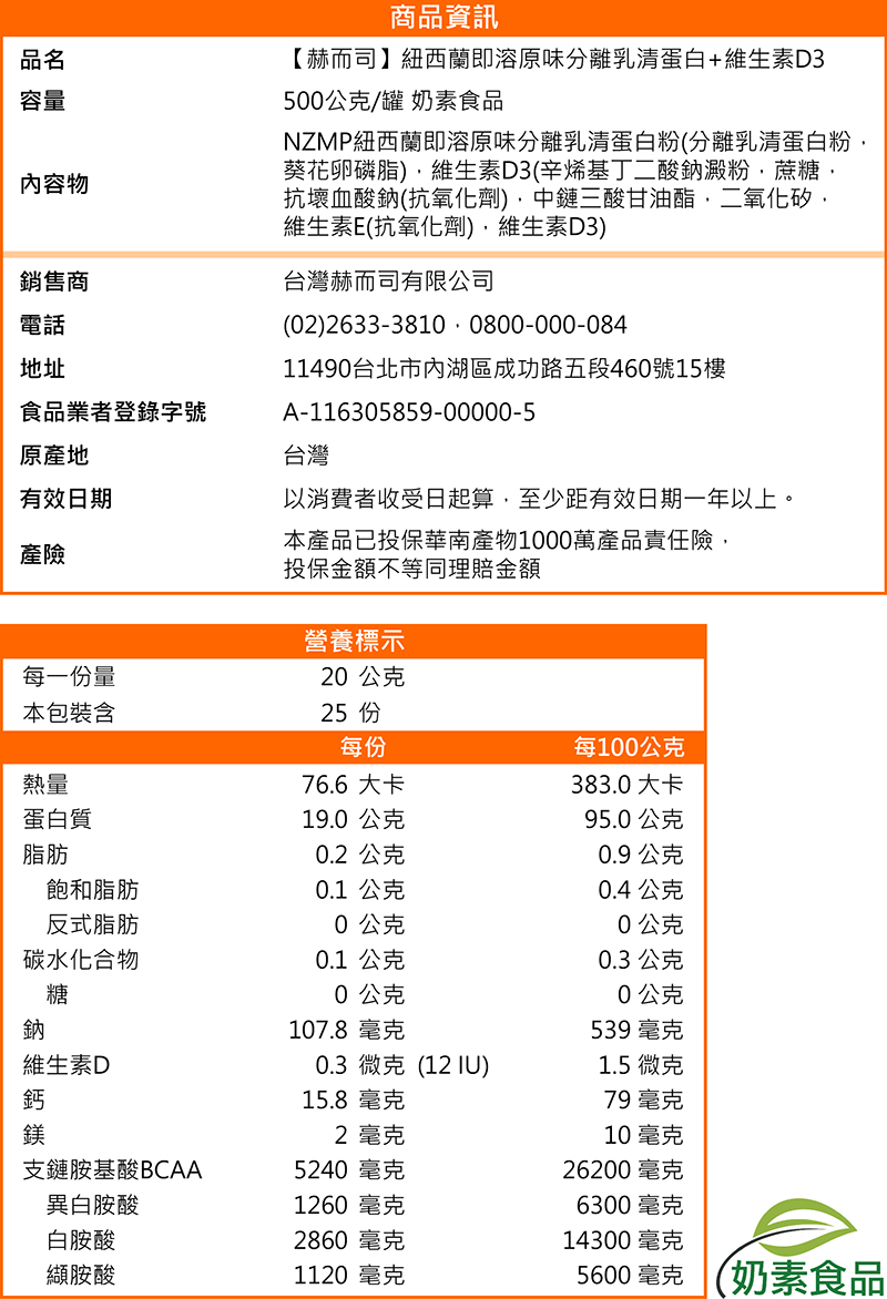 1️⃣NZMP紐西蘭即溶原味分離乳清蛋白粉+維生素D3(500公克*1罐)