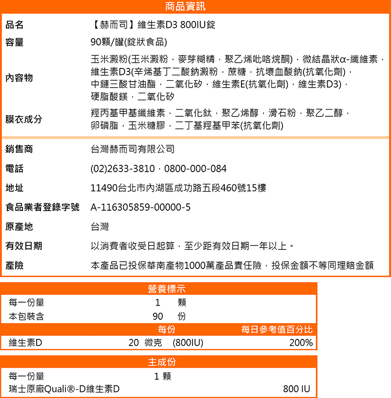 瑞士DSM精純Quali®-D羊毛脂來源非活性維生素D3,每錠高單位800IU非活性維生素D3