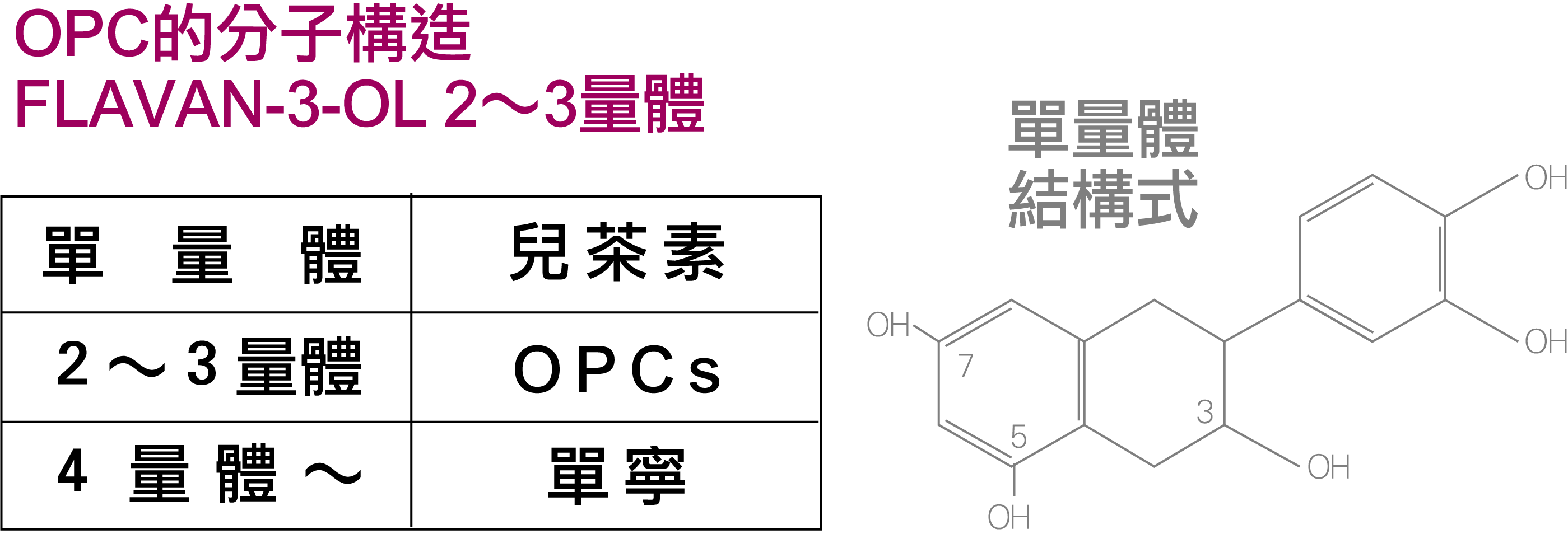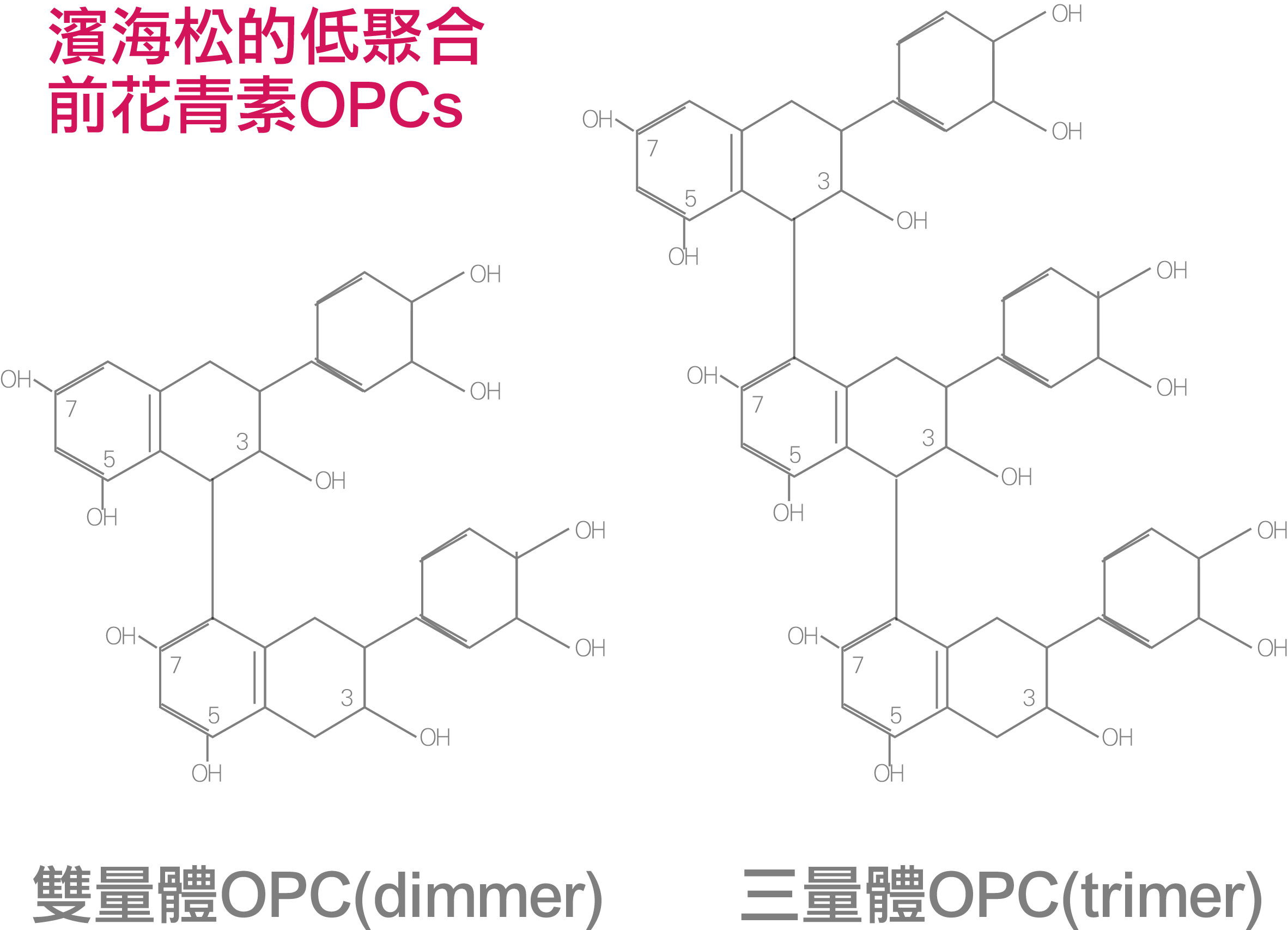 所謂低聚合前花青素OPCs是以2-3個「flavan3-o1」(黃烷-3-醇)形成的低分子多酚,2個「flavan3-o1」組成一個「雙量體」,3個 「flavan3-o1」組成一個「三量體」。其中「雙量體」與「三量體」具有很高的生物活性與保健效益,才能被稱為OPCs。