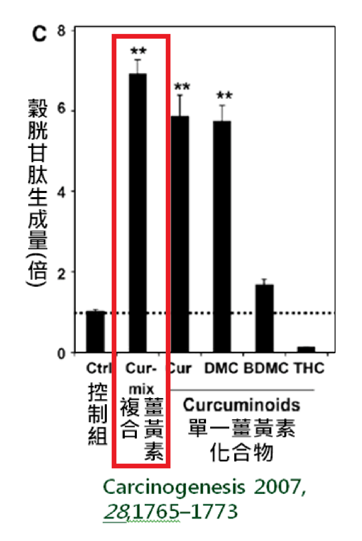 ▲複合薑黃素和單一化合物的穀胱甘肽的