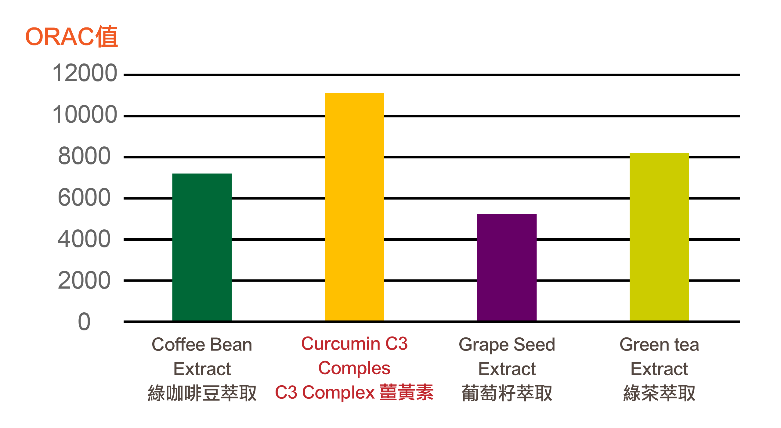 ▲複合薑黃素和單一化合物的穀胱甘肽的生成量比較\▲C3 Complex® 的ORAC值(ORAC值越高,效能越強)