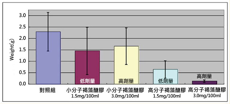 高分子褐藻醣膠顯示強烈的作用,且劑量愈高效果愈佳;小分子褐藻醣膠的作用低,劑量愈高效果愈差。